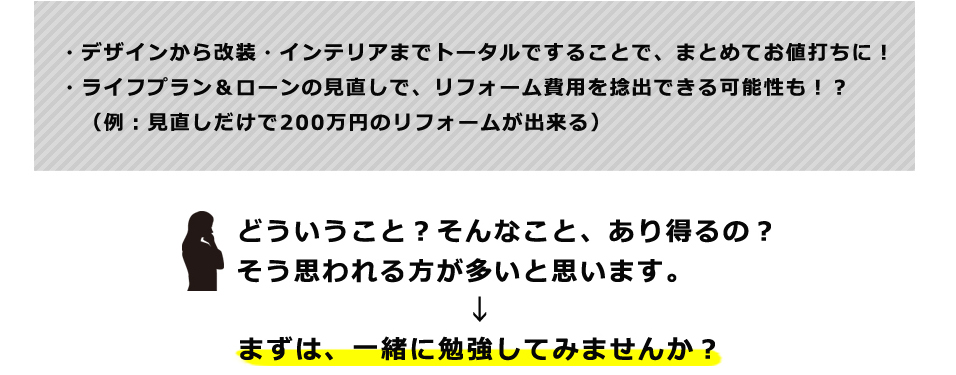 をお聞き頂ければ、手が届かないと思っていたリフォームを現実にすることもできるかもしれません。